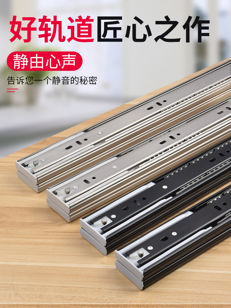抽屉轨道滑轨导轨滑道不锈钢橱柜加厚阻尼缓冲黑色三节静音滑轨