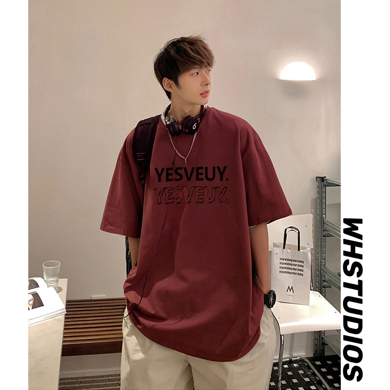 酒红色重磅t恤男夏季美式复古大码短袖ins潮牌宽松五分半袖情侣潮