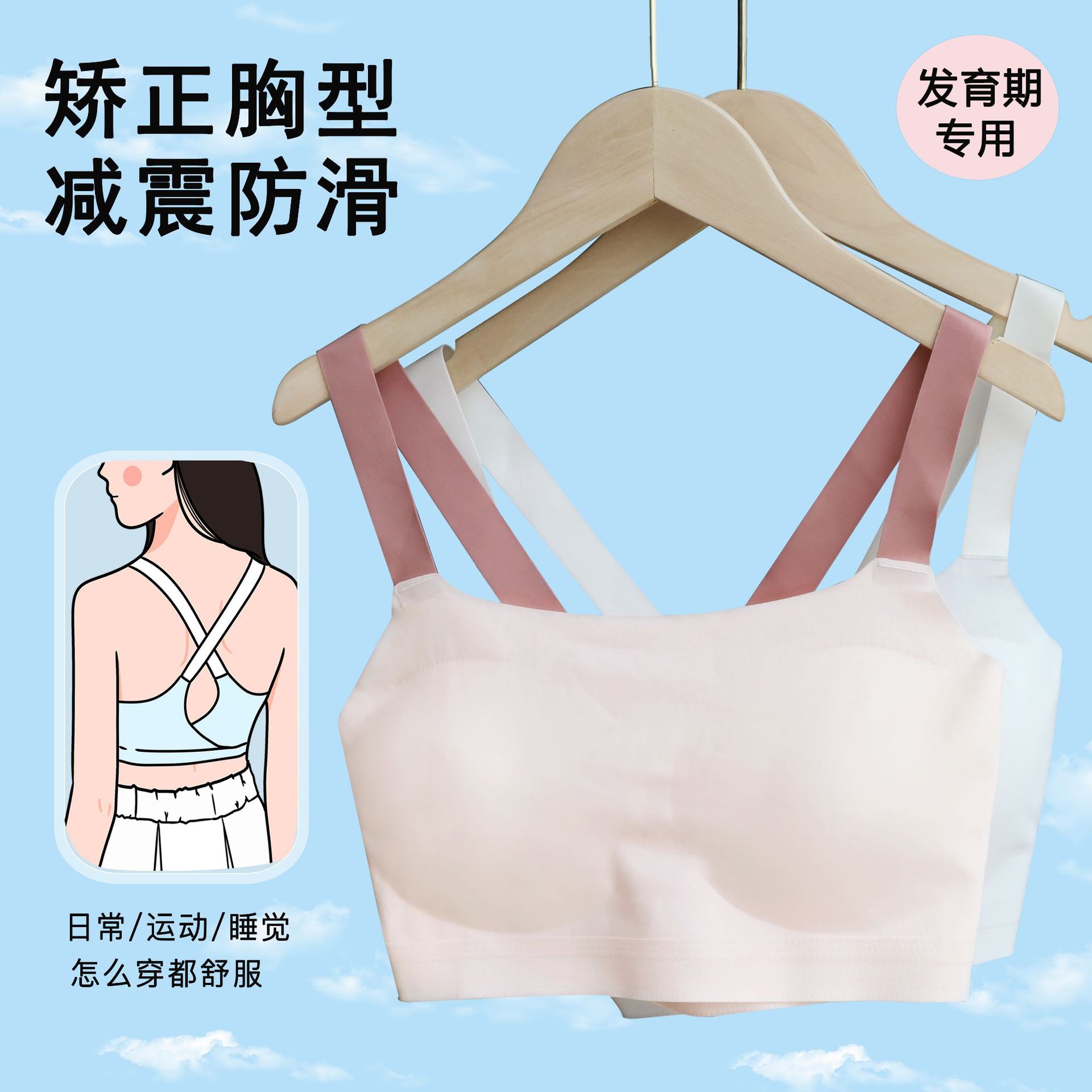 夏季发育期少女一阶段小学初中生交叉式撞色美背冰丝无痕运动内衣
