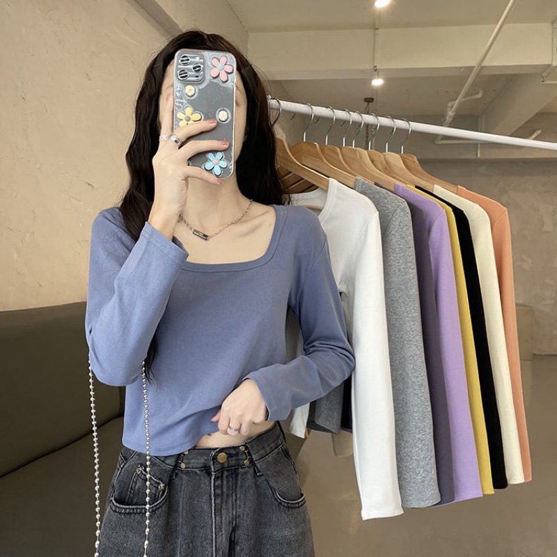 方领打底衫春秋新款小个子色长袖T恤女韩版宽松加绒加厚上衣ins