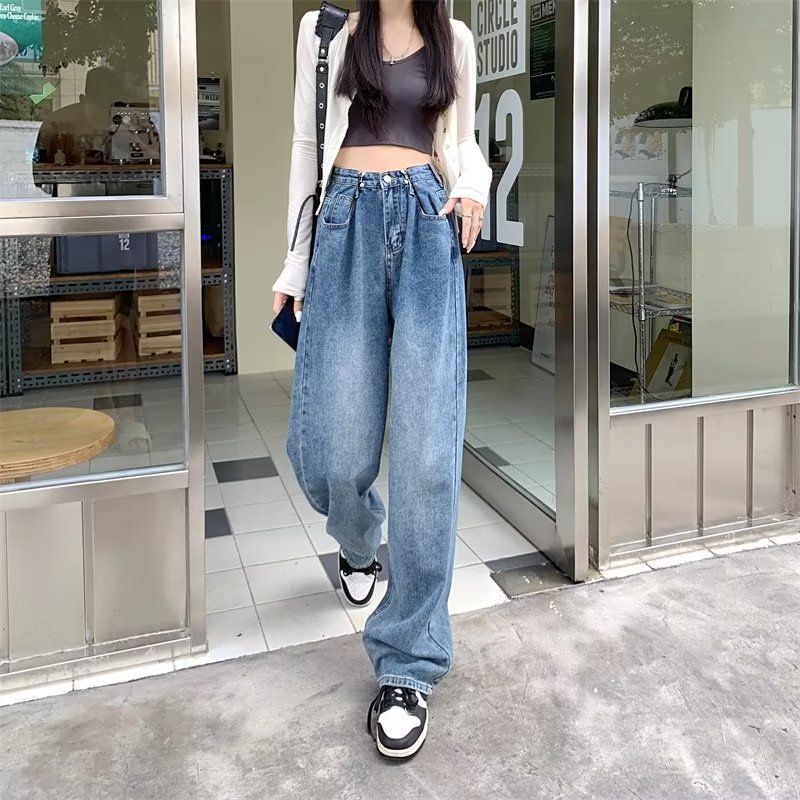 高腰阔腿牛仔裤女秋可调节高街宽松垂感梨形小个子直筒拖地长裤子
