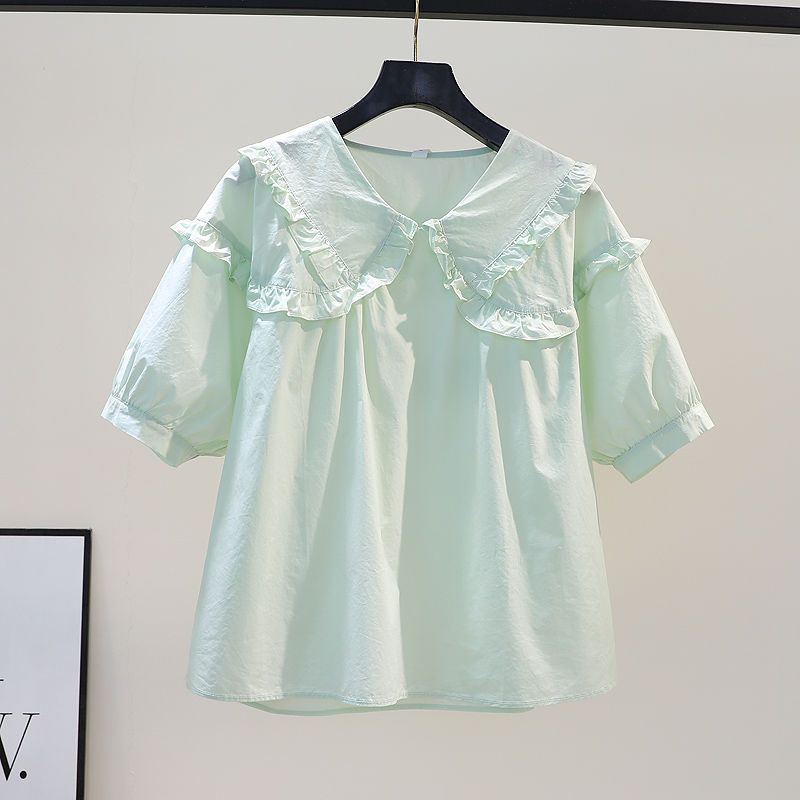 浅绿色木耳边娃娃衫女领短袖宽松纯棉衬衣夏季韩版甜美减龄上衣
