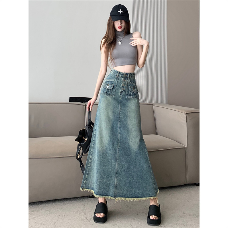 春季芭蕾风显瘦蓝色复古牛仔半身裙女做旧伞裙毛边牛仔裙辣妹半裙