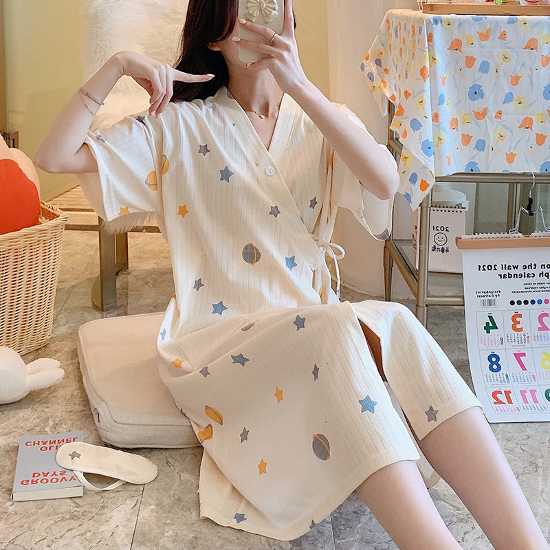 日式睡衣绑带和服袍女夏季新款短袖裙家居系女中长款浴袍女亚马逊