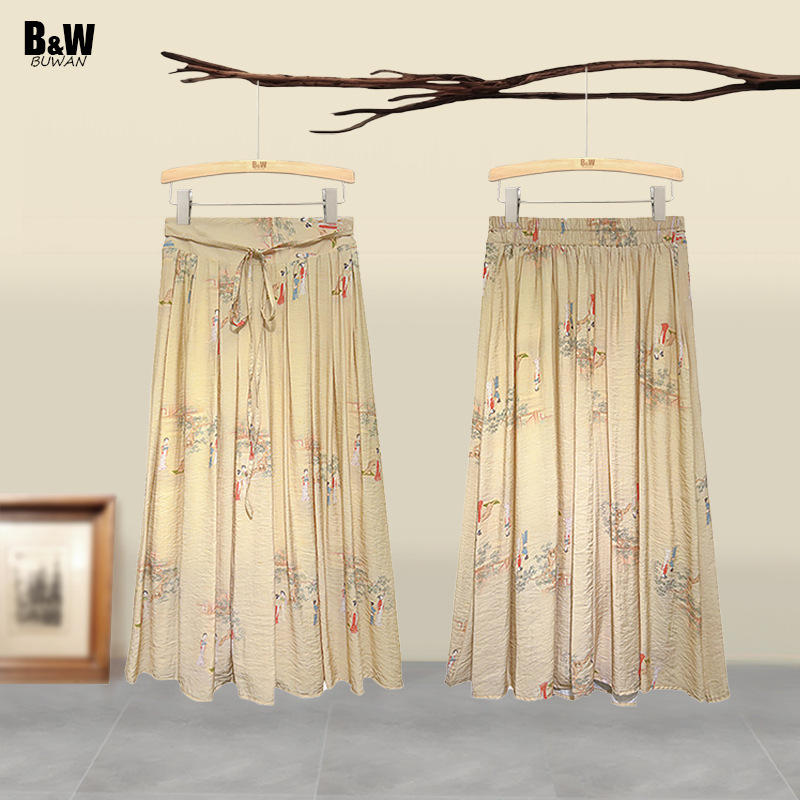 国风晕染印花压褶半身裙女2023夏季新款绑带装饰半松紧高腰百褶裙
