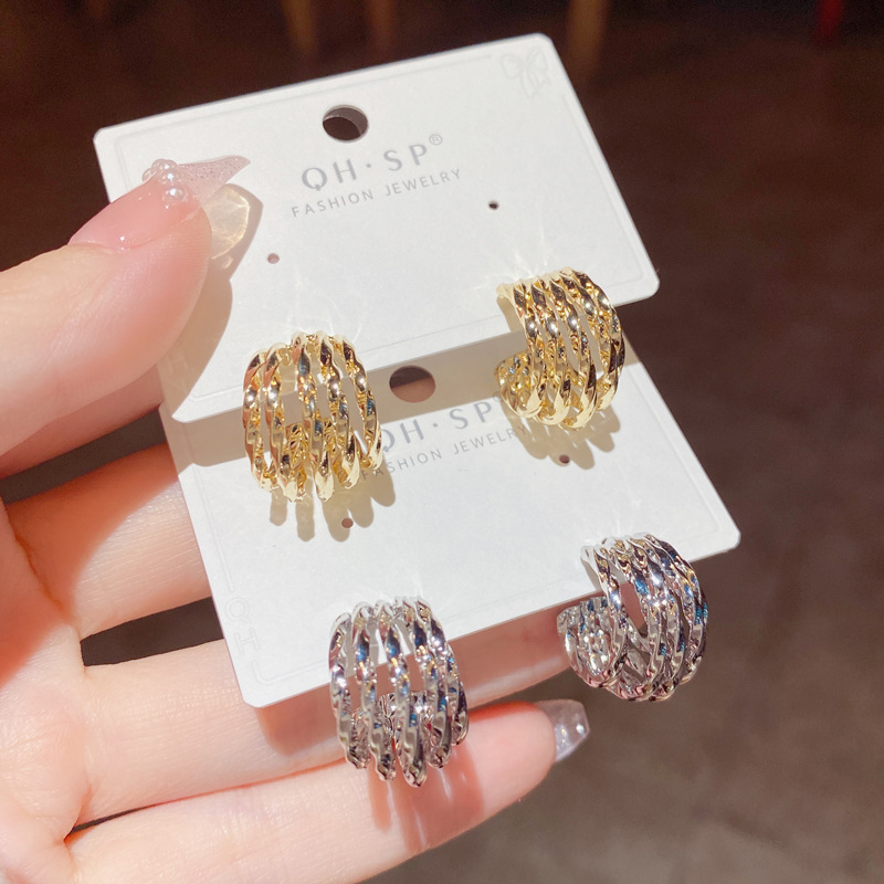 s925银针欧美时尚简约复古麻花多层耳圈女网红个性冷淡风耳钉耳环