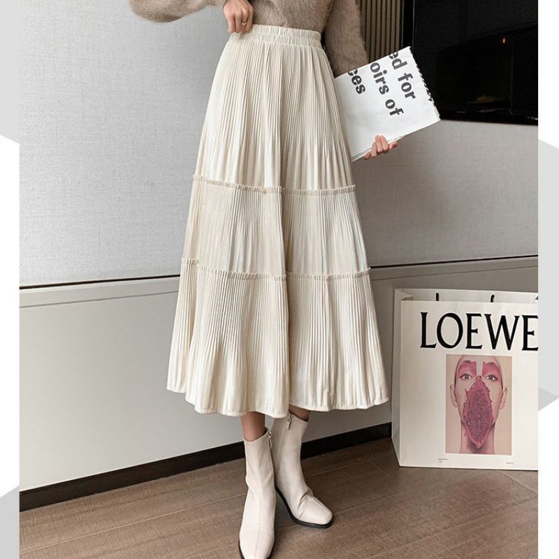 金丝绒半身裙2023年春秋季新款高腰百褶裙中长款灯芯绒字长裙子
