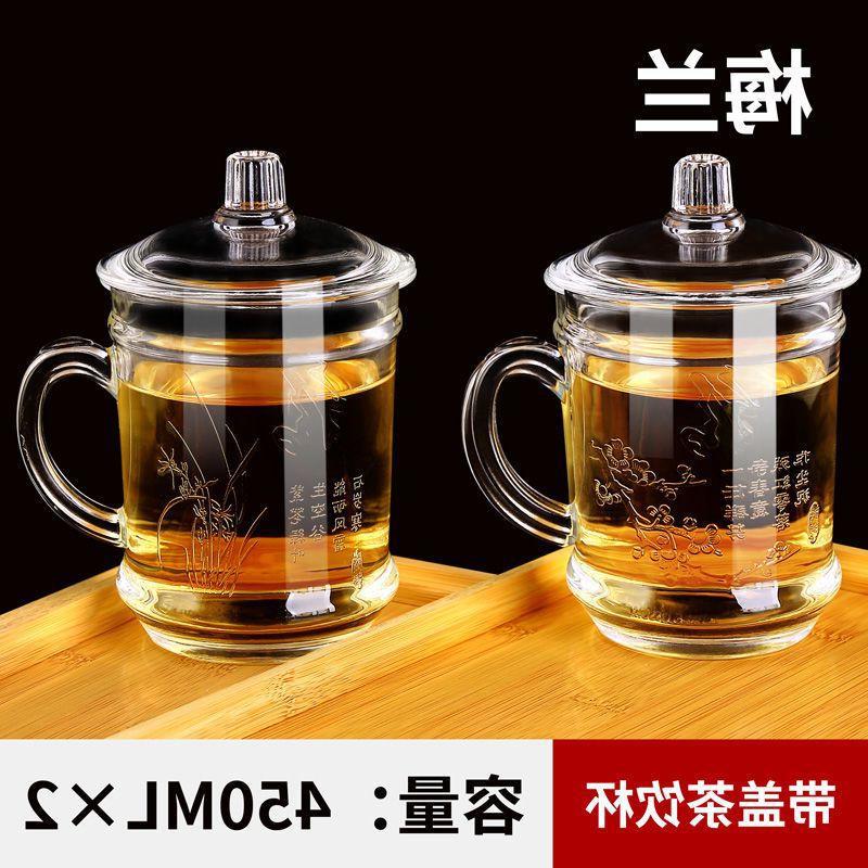 家用加厚耐热梅兰竹菊刻花玻璃杯办公泡茶杯大容量带盖带把水杯子